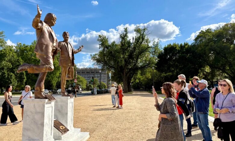 A ‘Titanic’ statue of Donald Trump and his ‘closest friend’ Jeffrey Epstein has appeared on the National Mall