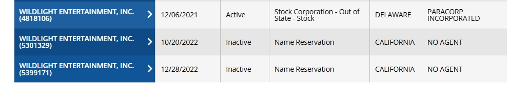 However, its ability to operate in California — where the studio’s Beverly Hills office was located — appears to have been terminated after required filings lapsed. In the image above, taken from the California Secretary of State’s website, it shows the Wildlight Entertainment name reservation as inactive.